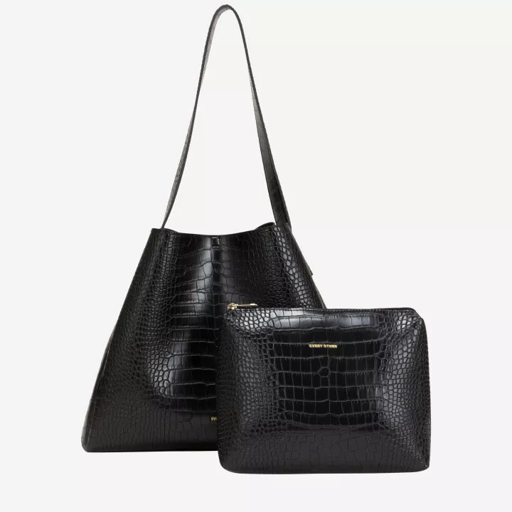 This black crocodile-textured tote from Every Other offers a sophisticated blend of style and practicality. Designed with a single strap and secure clasp fastening, it ensures ease of access while maintaining a polished look. Inside, a storage pouch provides organized space for essentials, making this bag ideal for both professional settings and everyday use.