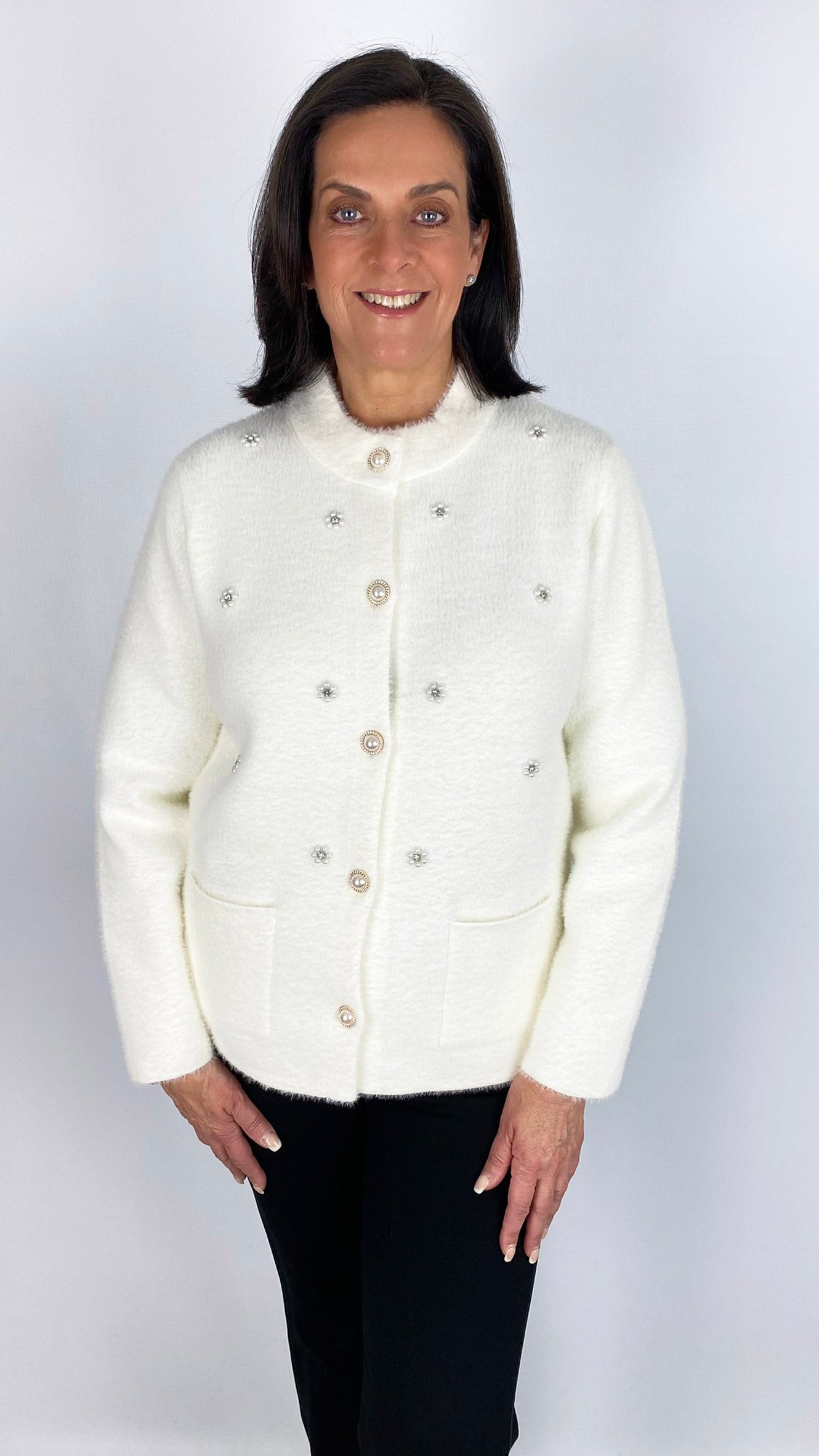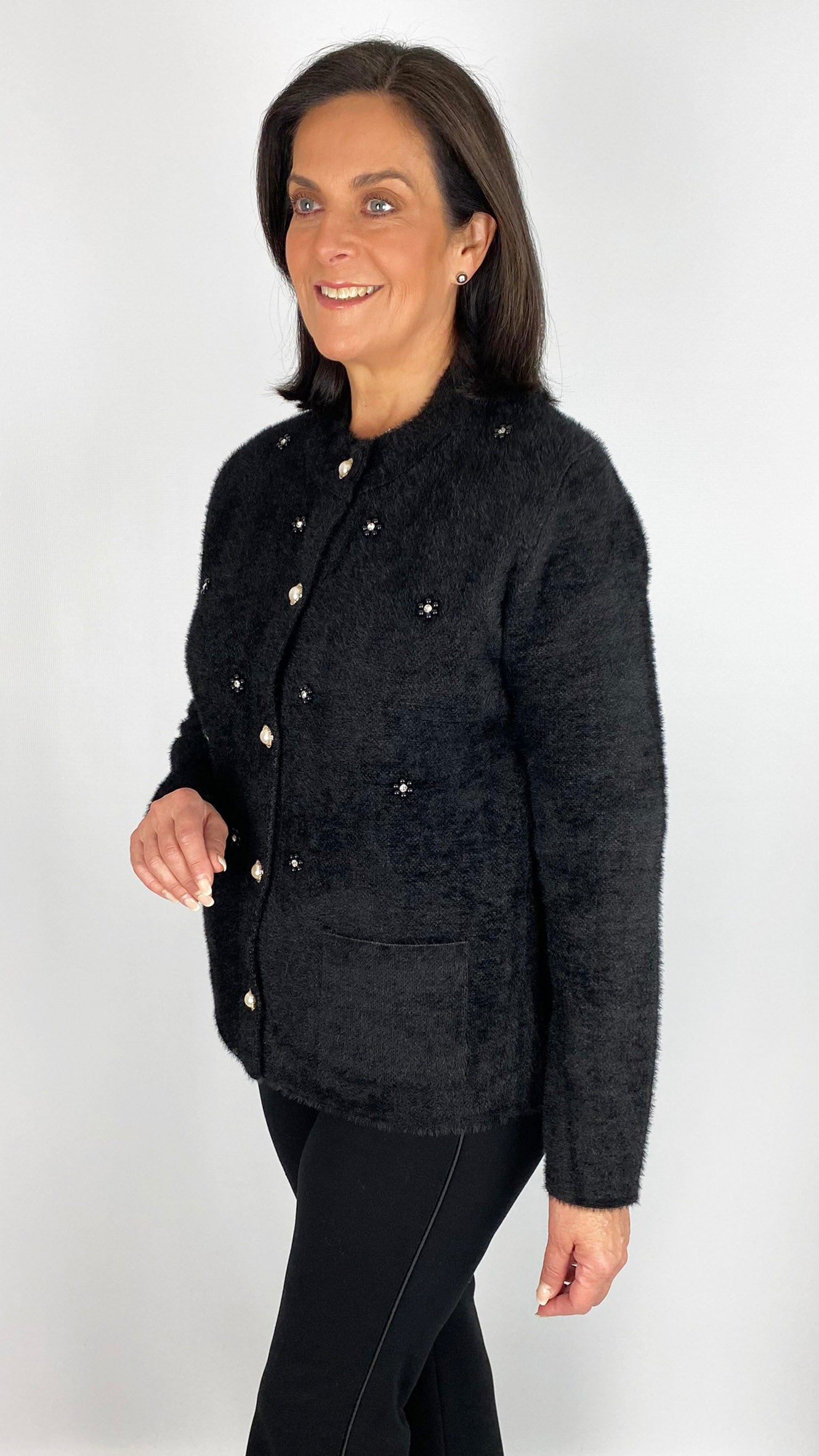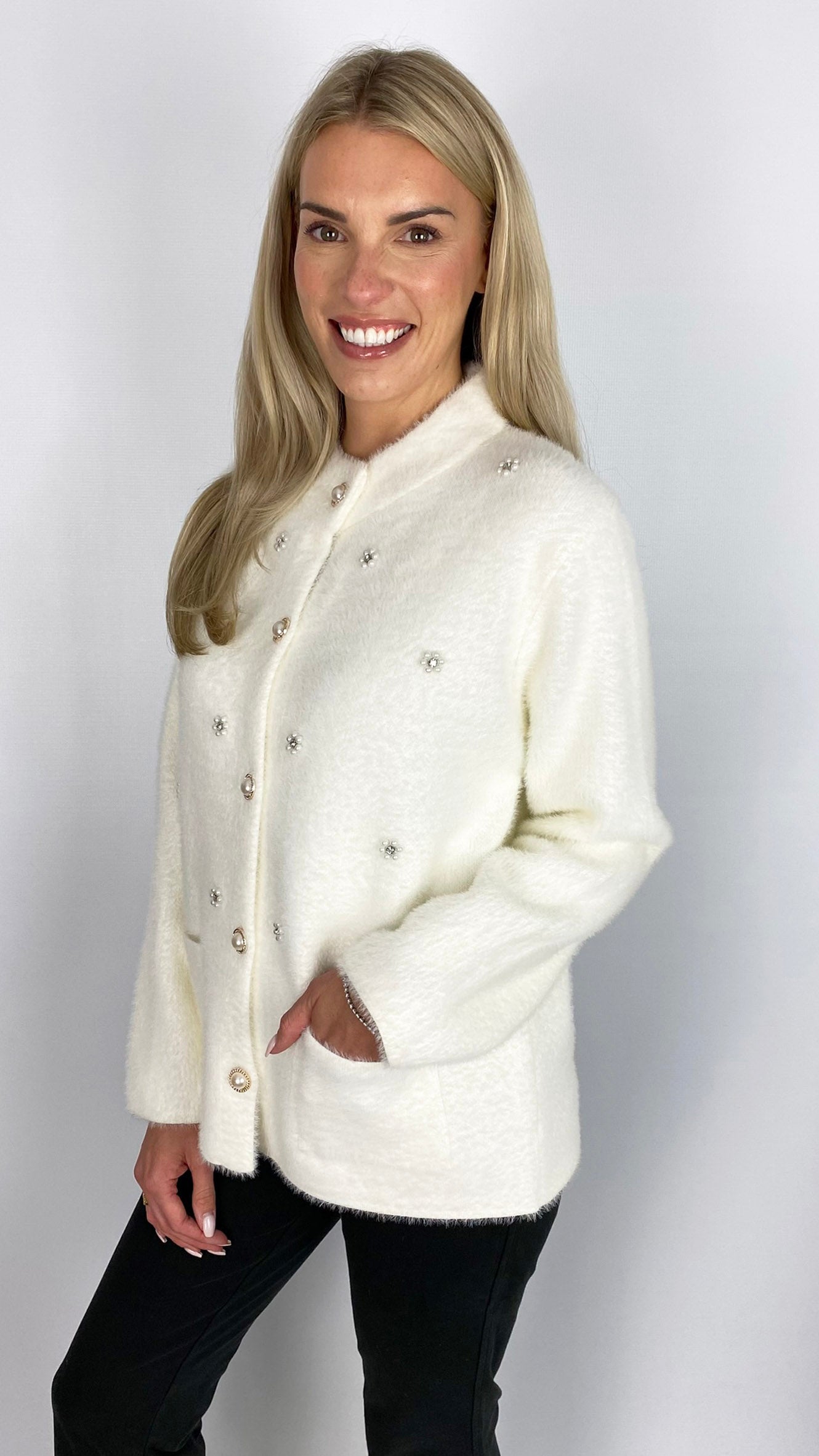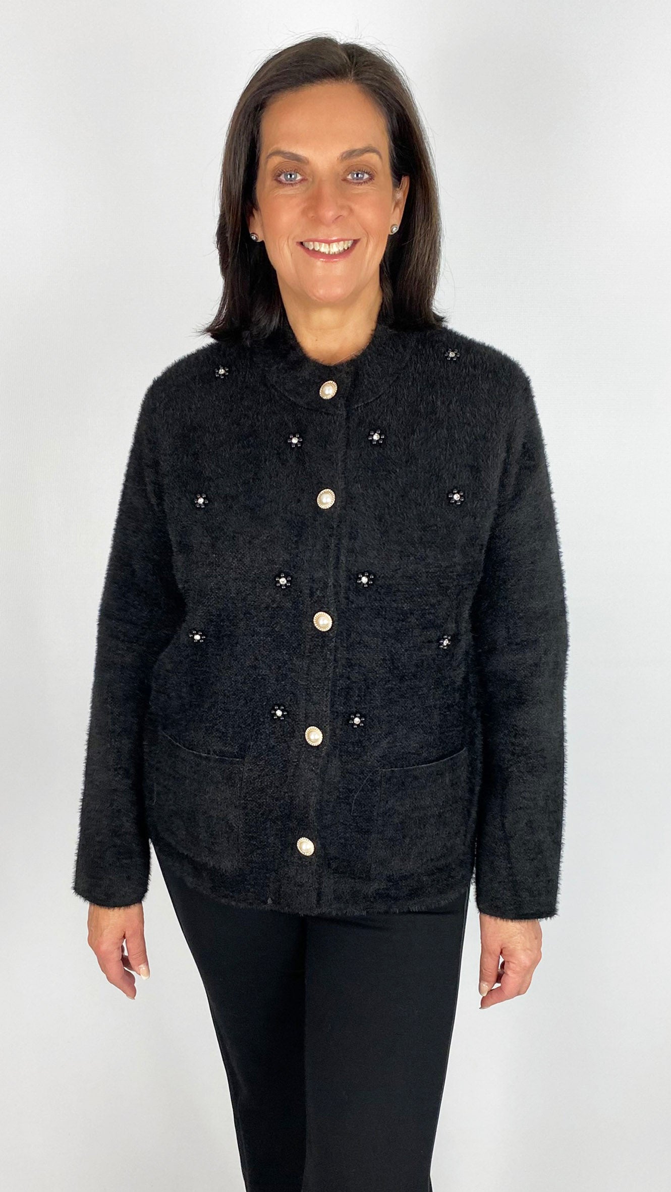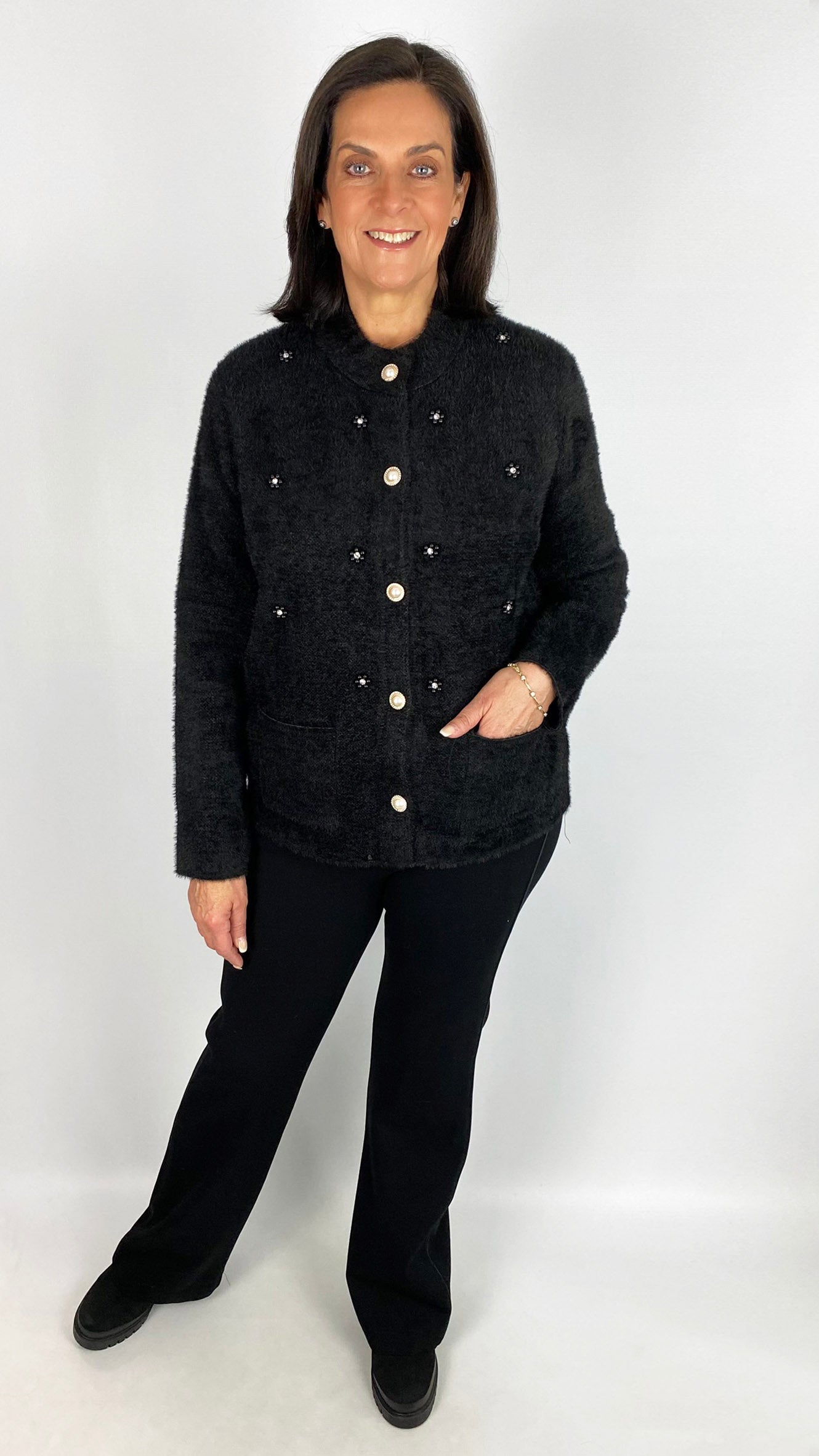Crafted from soft brushed knit, this jacket offers both comfort and style in two versatile colours. Expertly designed with functional patch pockets and striking pearl button fastening, it blends classic craftsmanship with modern embellishment for a refined statement piece. Ideal for elevating your layering wardrobe with luxurious texture and sophisticated detailing.