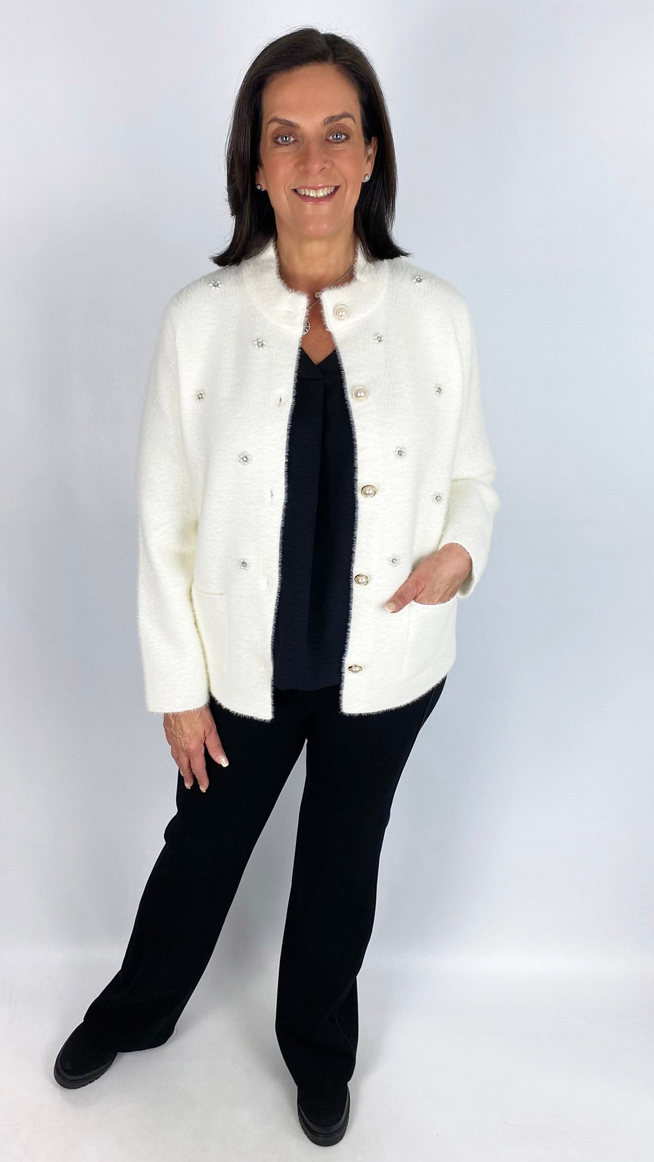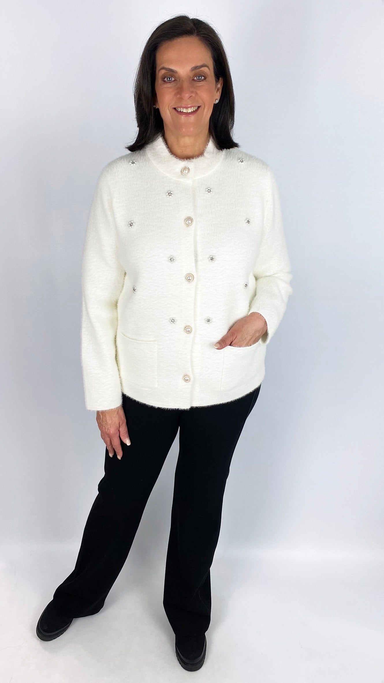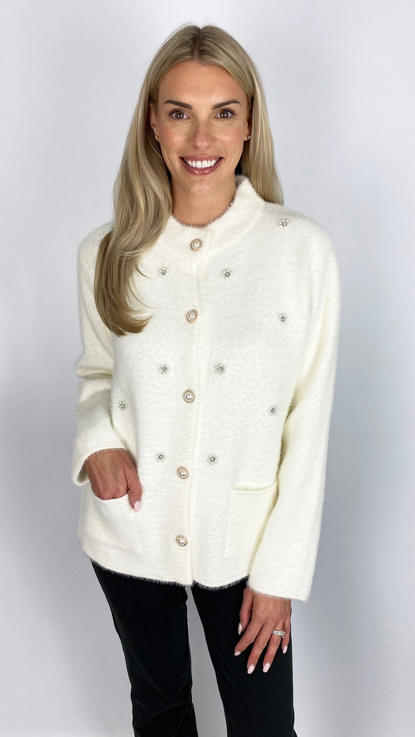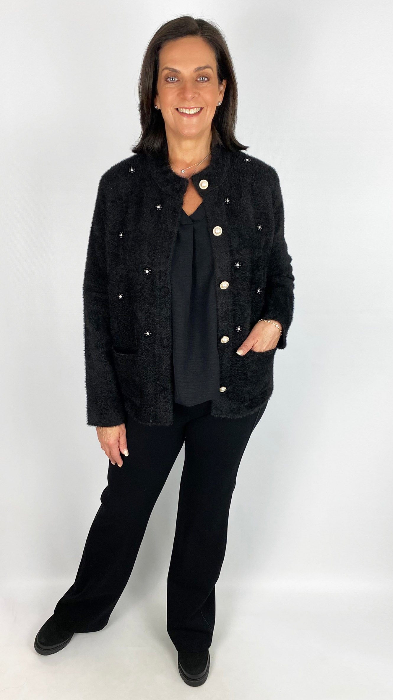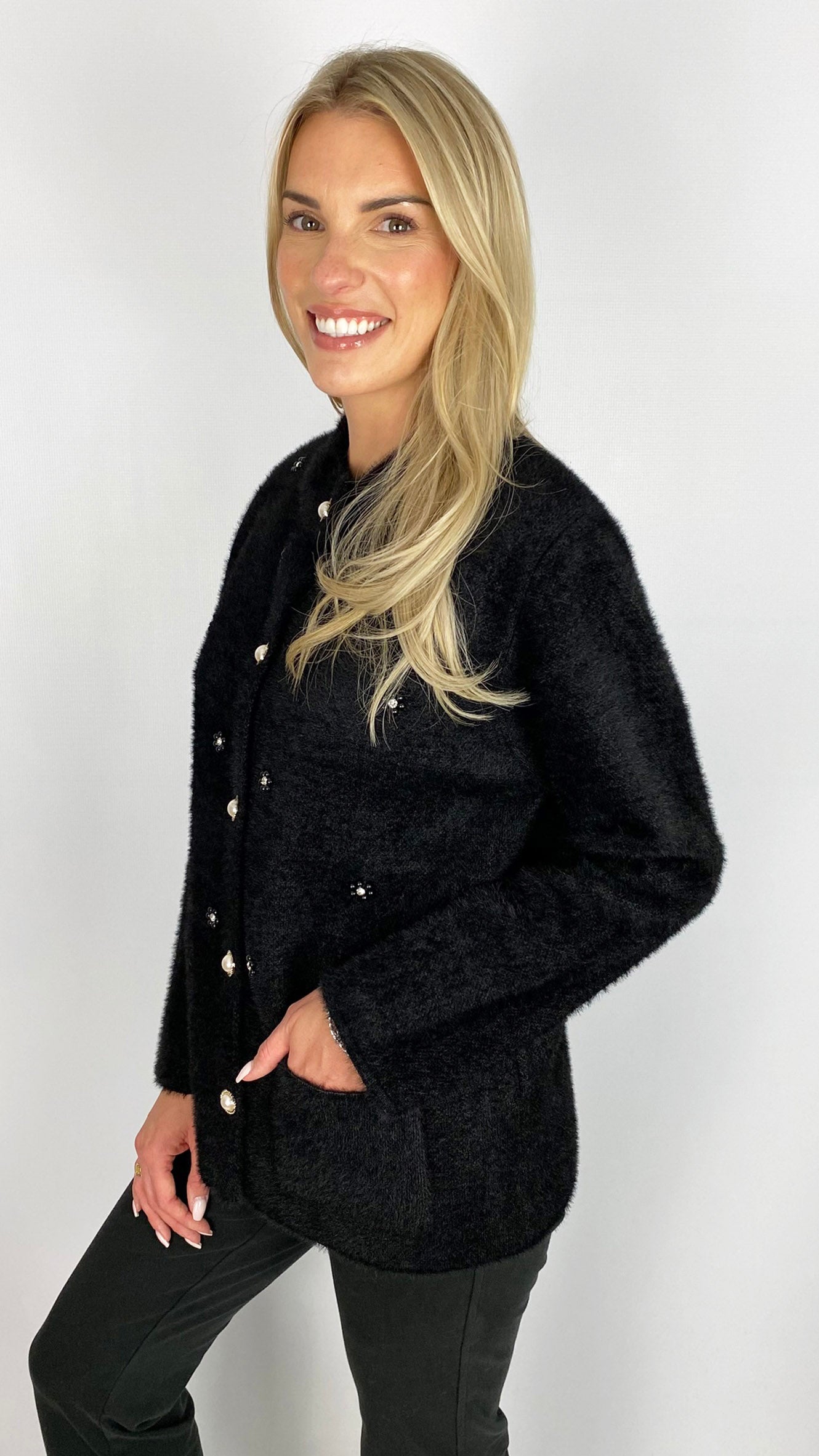 Crafted from soft brushed knit, this jacket offers both comfort and style in two versatile colours. Expertly designed with functional patch pockets and striking pearl button fastening, it blends classic craftsmanship with modern embellishment for a refined statement piece. Ideal for elevating your layering wardrobe with luxurious texture and sophisticated detailing.