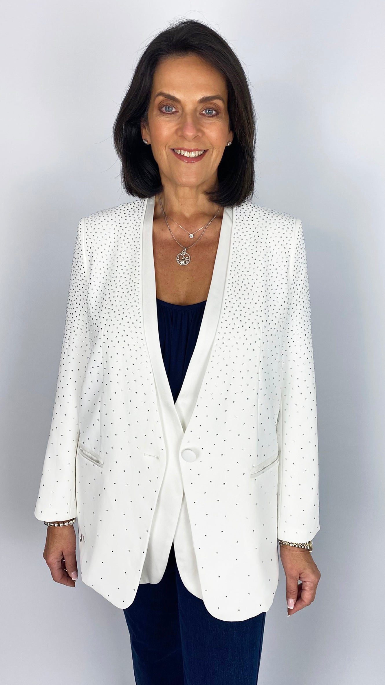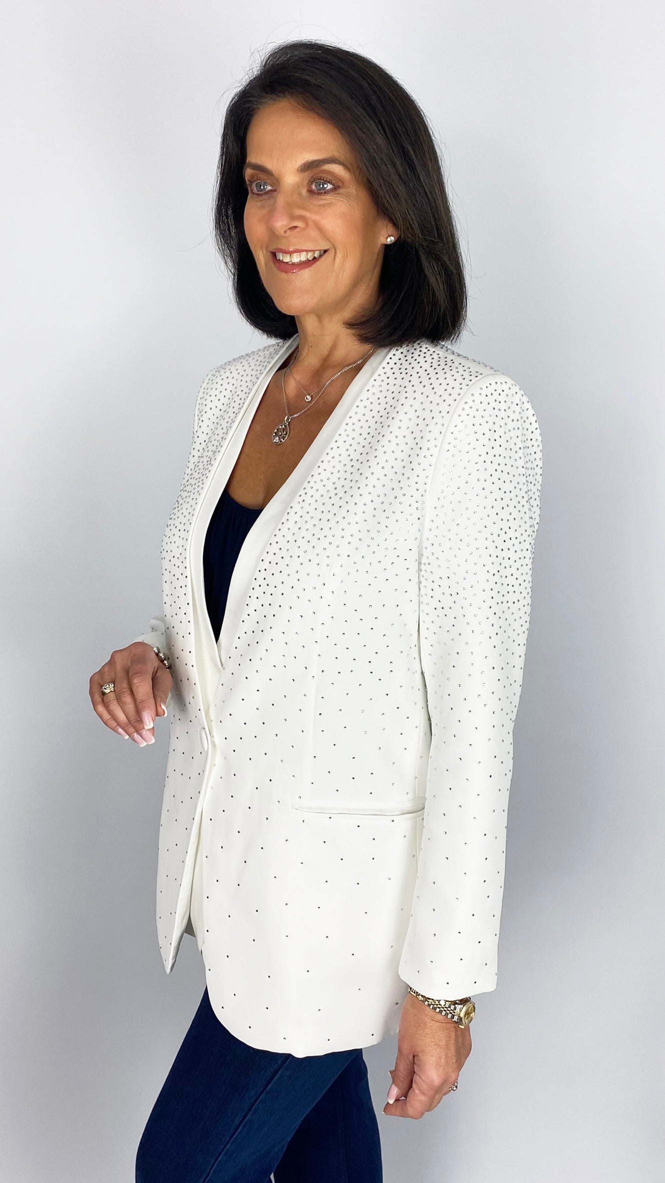 Elevate your wardrobe with this striking white blazer featuring panel detailing and graduated studding for contemporary edge. The collarless design offers a modern silhouette, while functional button closure ensures a polished fit. Faux pockets add practical styling without compromising the sleek aesthetic. Perfect for layering over dresses, pairing with tailored trousers for effortless sophistication, or wearing with your jeans to dress it down.