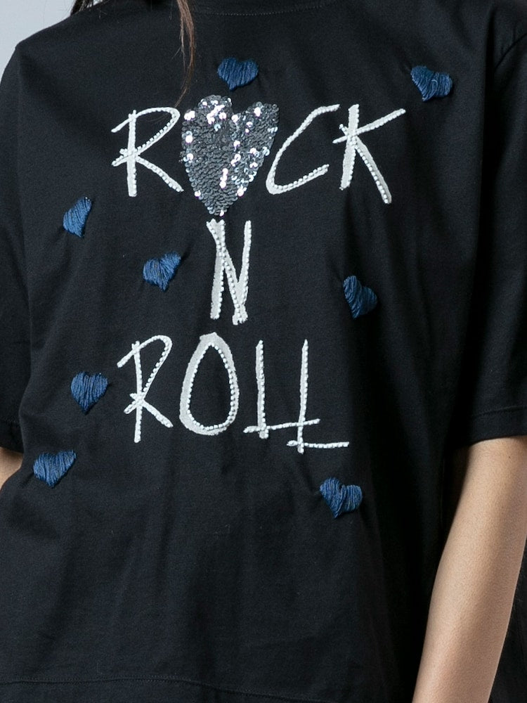 A laid-back staple with a bold twist, the Bella Tee in black combines relaxed comfort with standout detail. Crafted in soft cotton jersey, it features a classic crew neckline, short sleeves, and an easy hip-length fit. The beaded Rock n roll slogan is accented with hand-applied embroidered hearts for an unexpected edge. Effortless and eye-catching, the Bella Tee is perfect for adding personality to your everyday wardrobe. The model wears a size UK 10. Length from the top: 61 cm