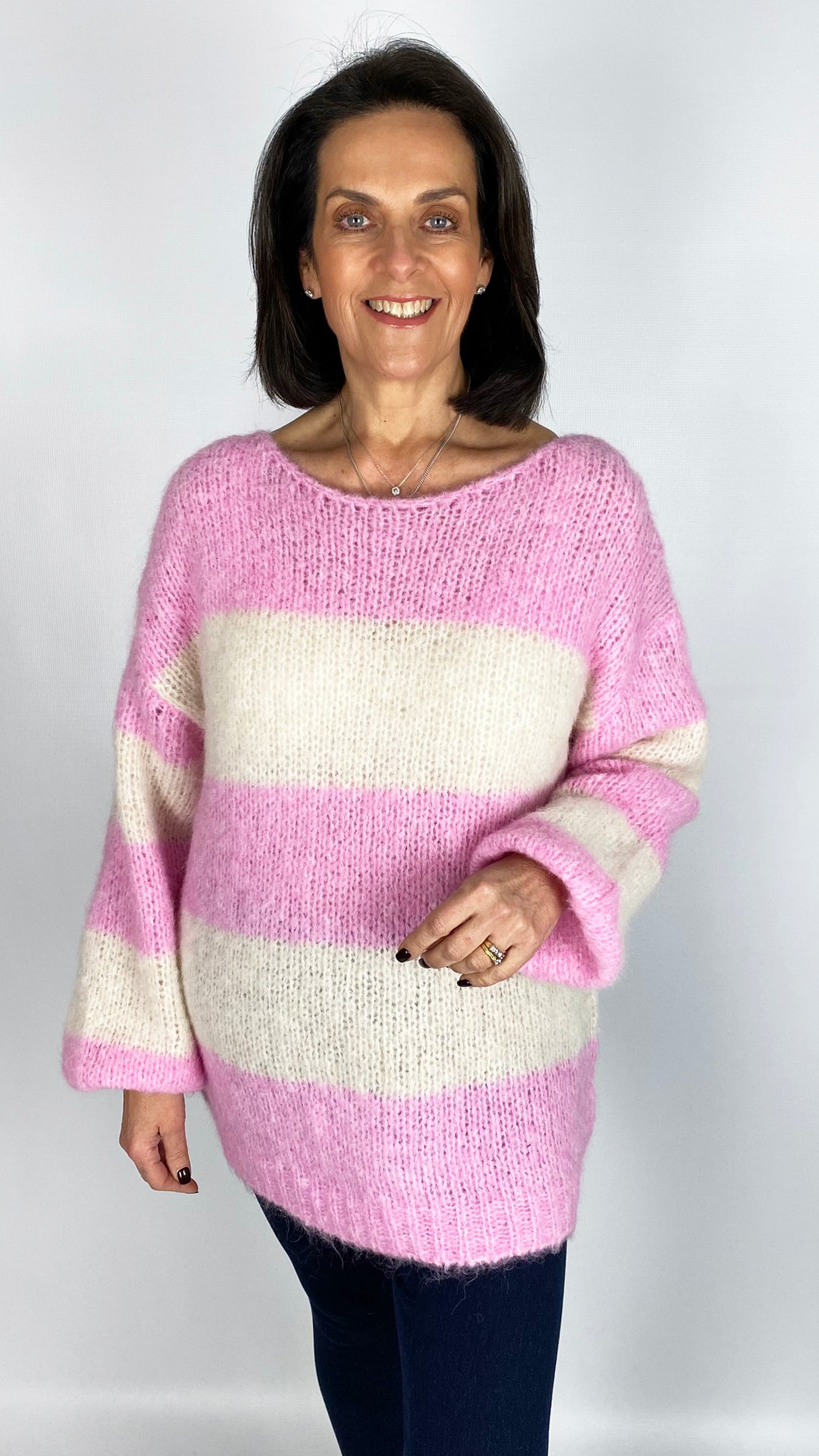 This striped knit jumper delivers understated elegance with practical appeal. Crafted from a quality knit that provides genuine warmth, it features distinctive cuffed balloon sleeves for contemporary proportion. The stripe pattern adds subtle visual interest across four carefully curated colour options, each designed to integrate seamlessly into your wardrobe.