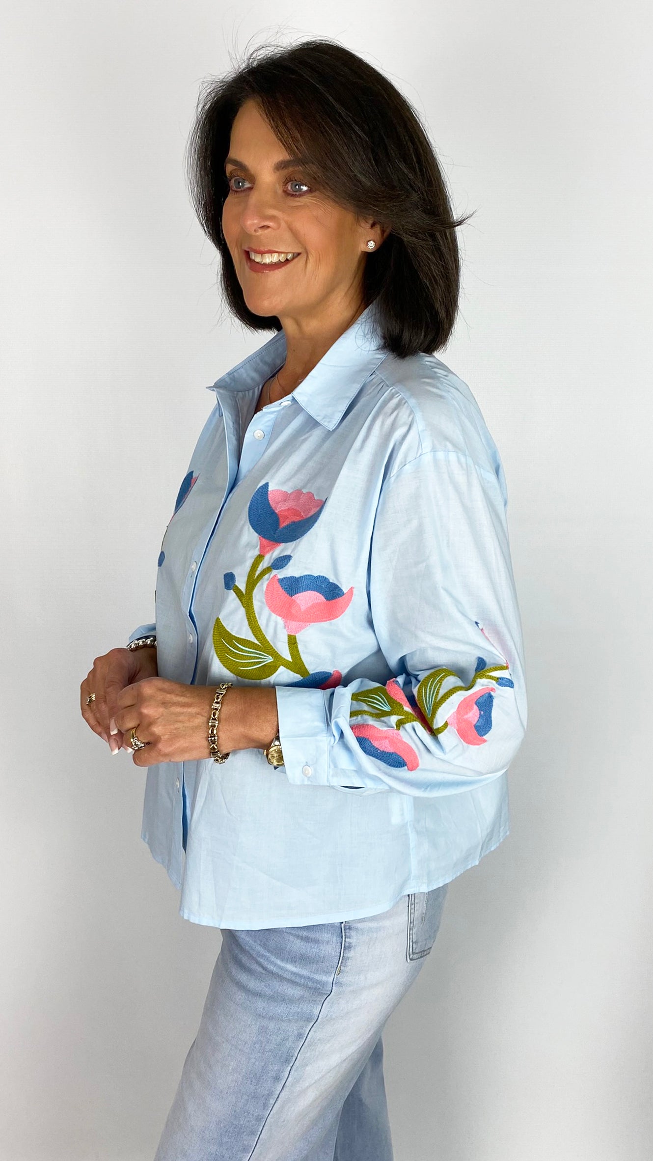This light blue cotton shirt combines timeless elegance with refined craftsmanship. Delicate floral embroidery adorns the body and sleeves, adding subtle visual interest to an everyday essential. The classic collar and button-through front create a versatile silhouette that transitions effortlessly from casual to smart-casual settings. Crafted from quality cotton, it offers comfort and breathability for all-day wear. A wardrobe staple that elevates any outfit with understated style.