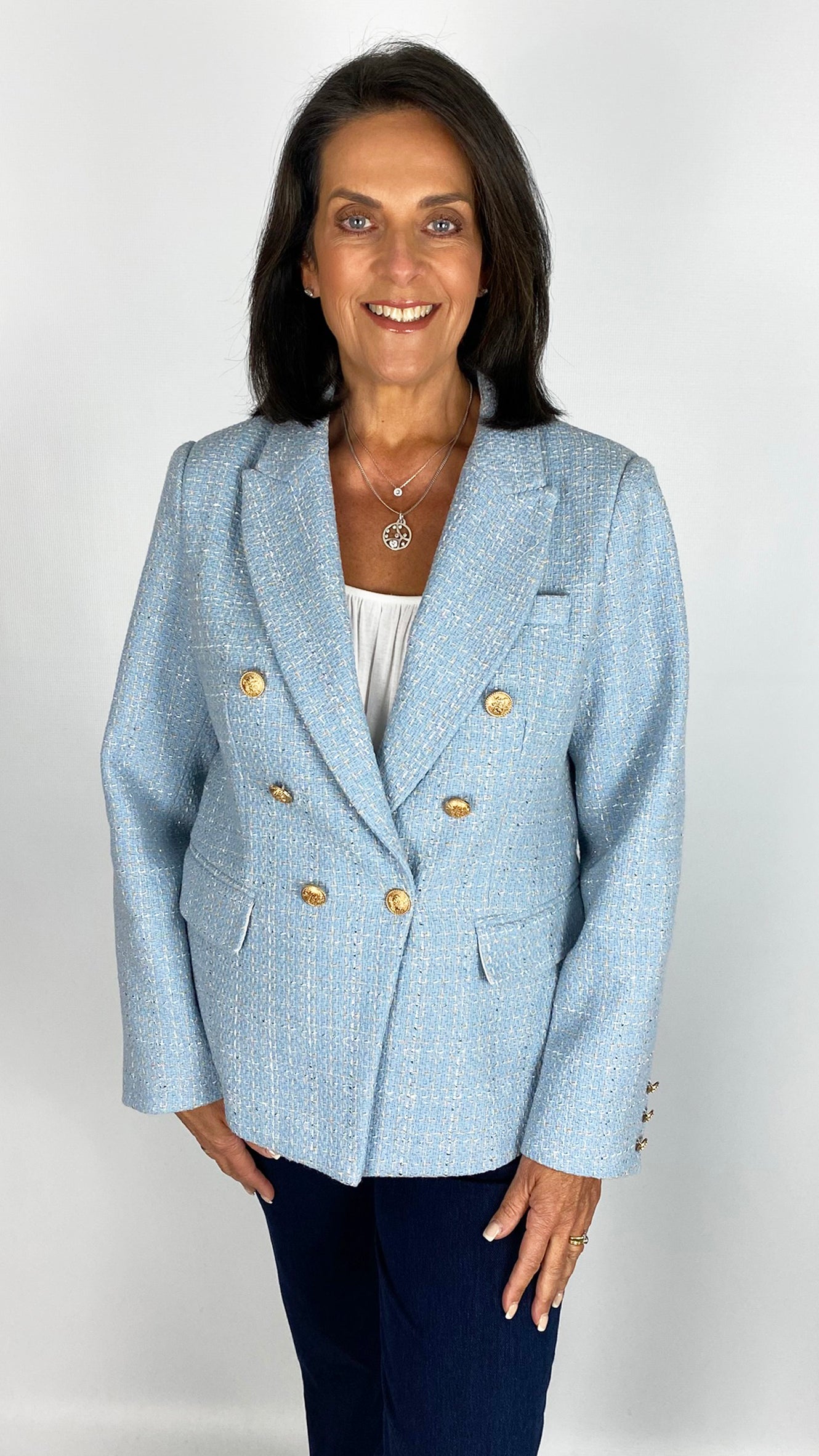 This double-breasted blazer channels high-end tailoring with its sophisticated silhouette and refined details. Lustrous lurex thread weaves subtly throughout the fabric, catching light with every movement for an understated shimmer. Statement gold buttons punctuate the front closure and cuffs, elevating the piece with a touch of luxury. The structured design flatters the frame whilst maintaining effortless elegance.