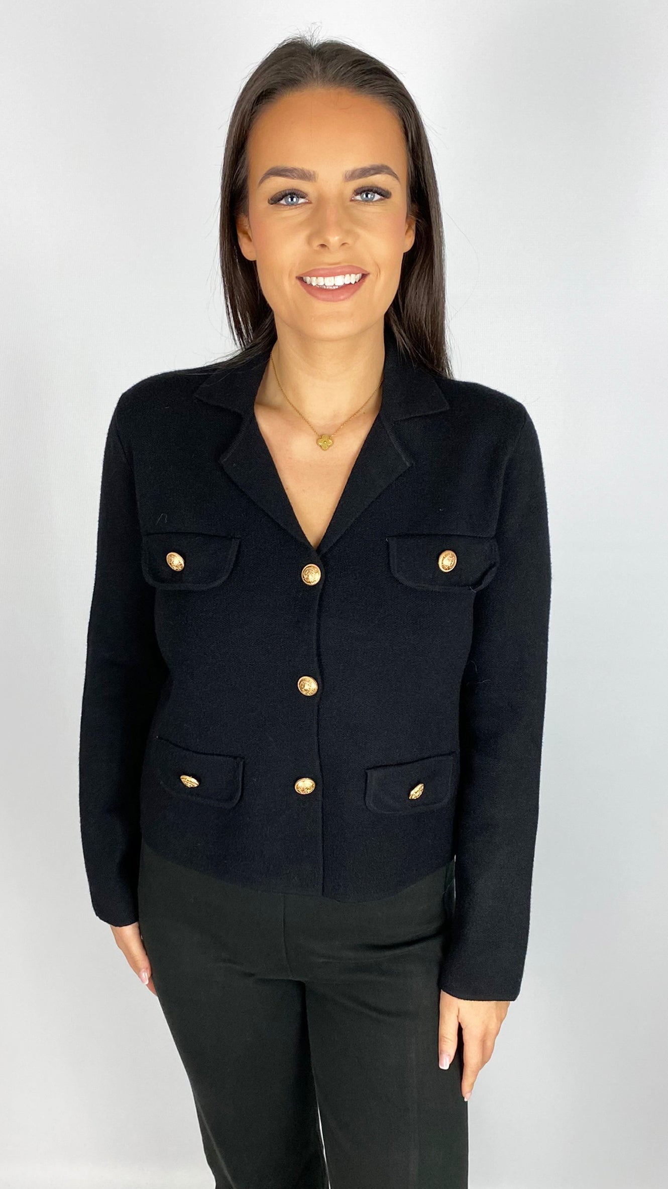 This fine knitted Parisienne jacket, available in four refined colours, features a classic collar and faux pockets for a streamlined silhouette. Accentuated with statement gold buttons, it delivers a sophisticated touch that elevates any outfit. Combining elegant design with comfortable craftsmanship, this jacket is perfect for adding polished style to both casual and formal ensembles.