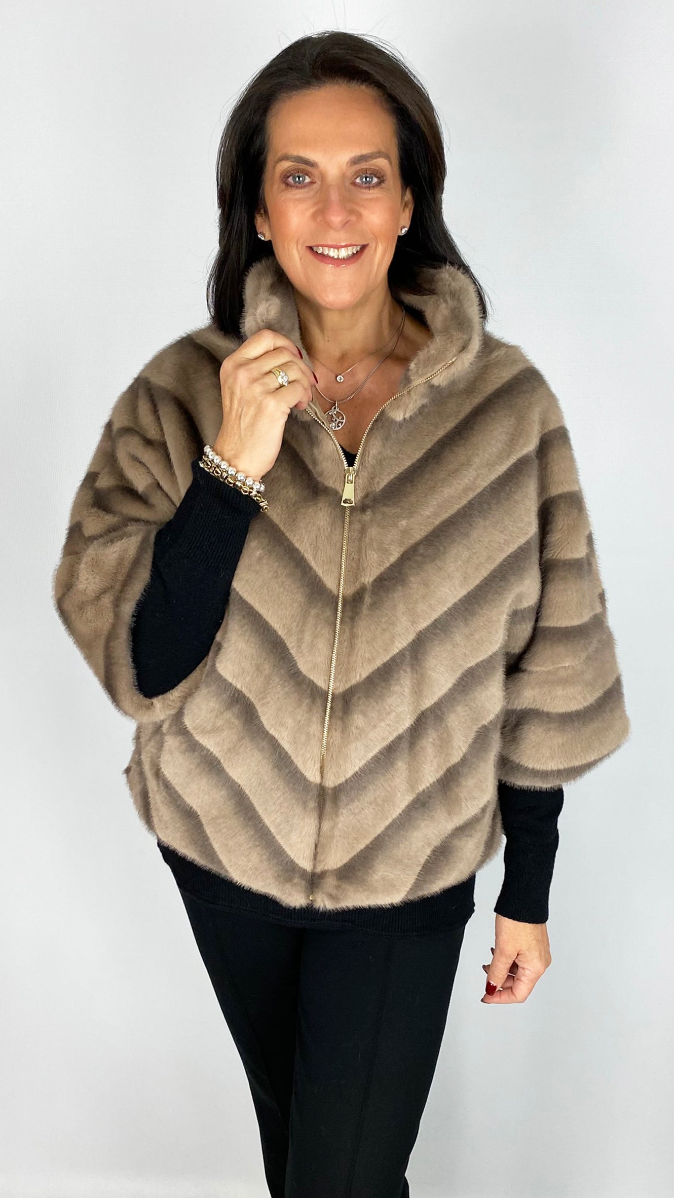 This fluted 3/4 sleeve luxury faux fur jacket is designed with a funnel neck collar and a practical zip-through front for effortless styling. Fully satin lined for a smooth feel, it also includes discreet hand pockets to keep essentials close and add convenience. Available in three refined colours, this jacket offers a blend of elegance and functionality for a distinguished wardrobe staple.