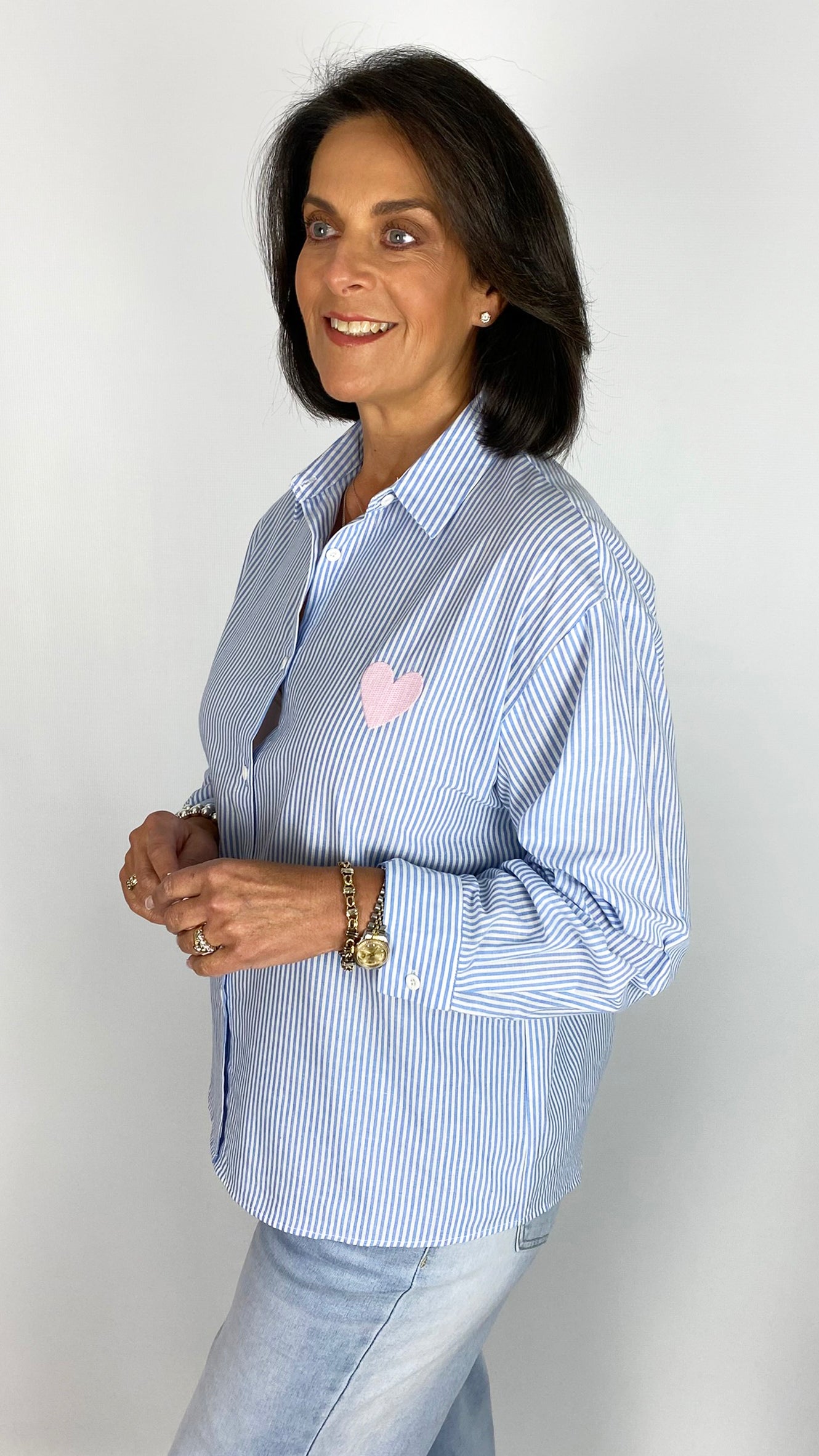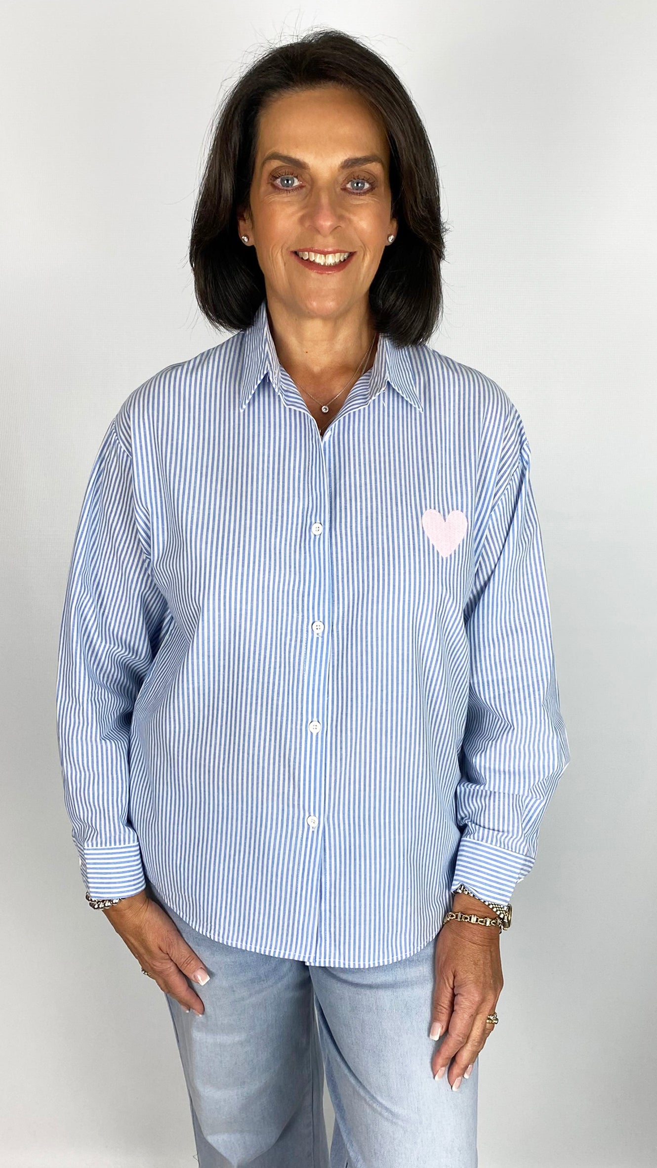 A thoughtfully designed pinstripe shirt that balances minimalist aesthetics with meaningful embellishment. The classic button-through construction offers styling flexibility, while intricate stitching brings two distinctive details to life: a delicate heart on the chest and an uplifting message across the back reading "I hope something good happens to you today." This piece transcends typical shirting, appealing to those who seek garments that are a little bold.