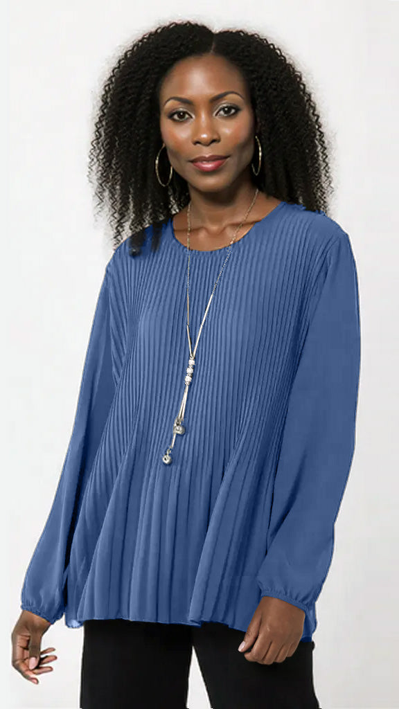 Crafted from lightweight chiffon, this pleated front top is fully lined through the body for added comfort and coverage. The elasticated cuffs ensure a tailored fit and enhance the garment’s refined silhouette. Offered in nine distinctive colors, it is a sophisticated choice that effortlessly transitions from workwear to evening attire.