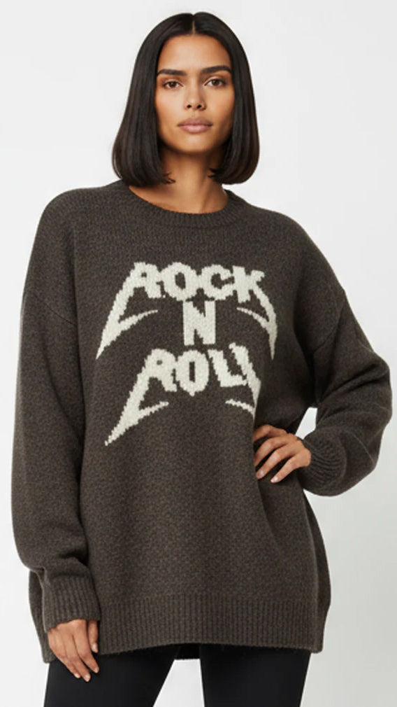 Introducing the Revolution Jumper, a must-have for your winter wardrobe. This hip-length wool mix jumper is not just soft and warm but also makes a bold statement with its eye-catching Rock n roll slogan design in brown and white. With long sleeves and an oversized fit, it offers both comfort and style. The classic crew neck adds a touch of versatility, making it the perfect choice to pair with your favourite jeans or leggings for a casual yet fashionable look. The Revolution Jumper is the ideal addition to your collection for standing out and staying cozy this season. The model wears a size UK 10. Please go down 1 size if you like it better less oversized. Length: 70 cm