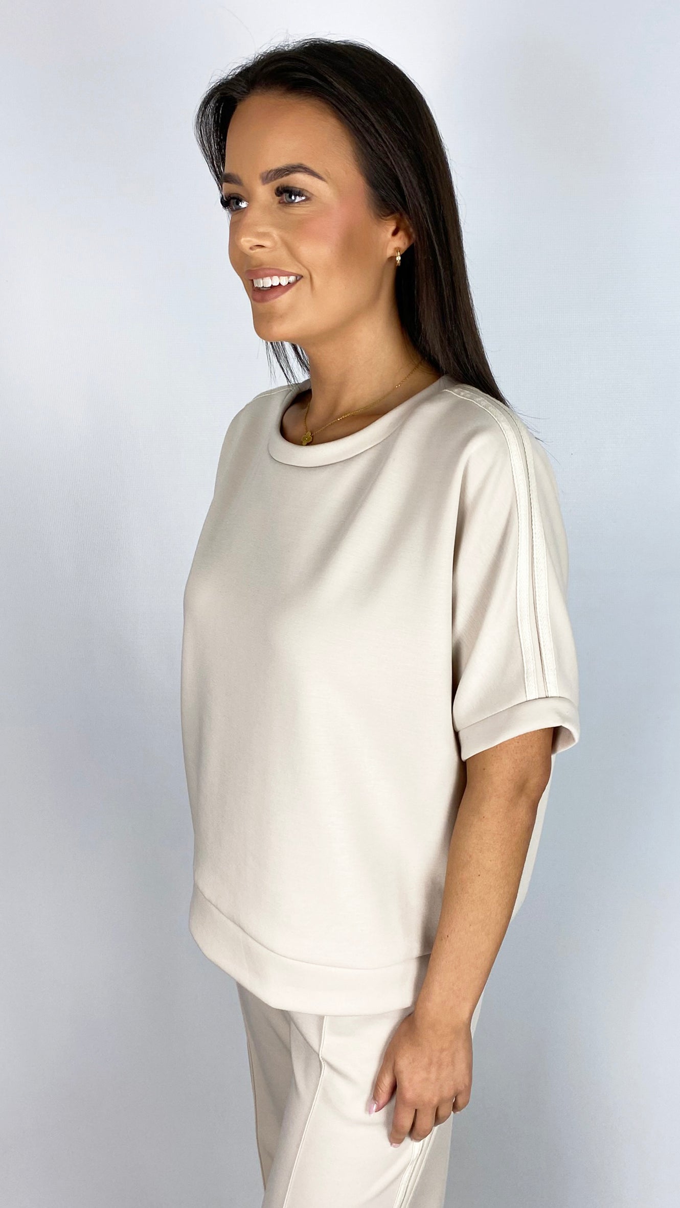 Build a curated capsule with these thoughtfully designed separates. The short-sleeve top showcases distinctive stripe detailing on the shoulder, while the wide-leg trousers feature a relaxed pull-on silhouette with drawstring waist adjustment and complementary side stripe. Both pieces are crafted from ultra-soft fabric for all-day wearability. Available in two colour palettes, these independent pieces allow you to layer and coordinate according to your personal aesthetic. Purchase individually to tailor your collection.