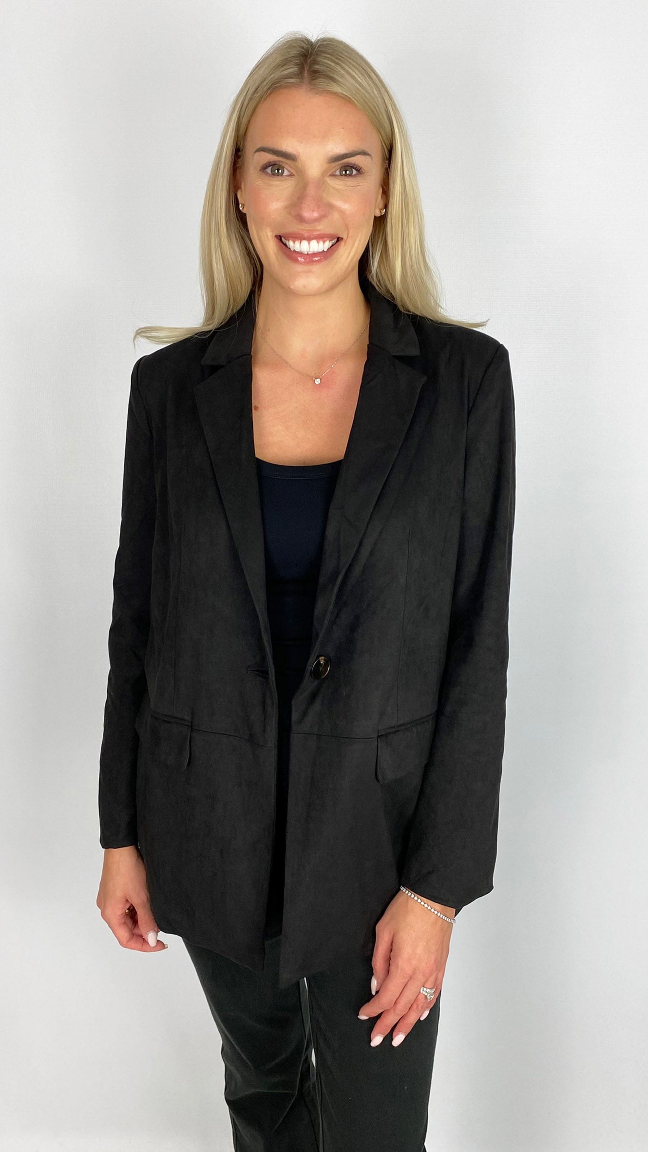 This Suedette blazer features a sophisticated button fastening that ensures a secure and polished closure. Designed with a classic collar, it adds a refined touch that complements both professional and casual looks. Available in two versatile colours, this blazer combines style with practical detailing for a tailored finish.