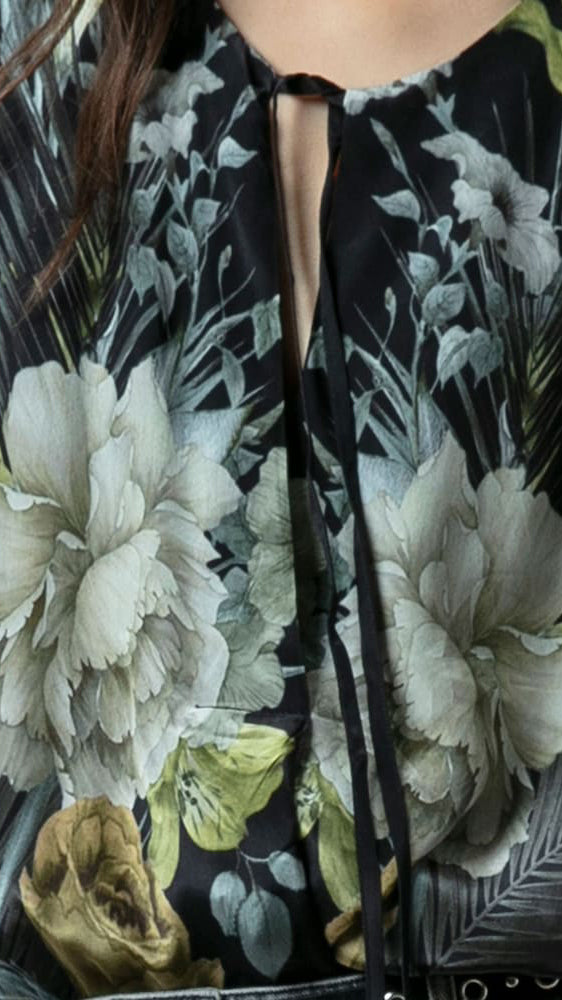 The Taylor Top offers an easy fit with a flattering V-neckline and pleat detailing at the front, complemented by ties with skull cord ends for a unique touch. Crafted in our floral Camellia placement print in yellow . Made from a silk like fabric, it features a lined front, short sleeves, and a hip-length cut. This versatile top adds effortless style to any outfit. Dry clean only.